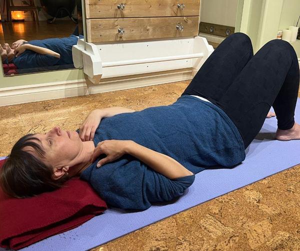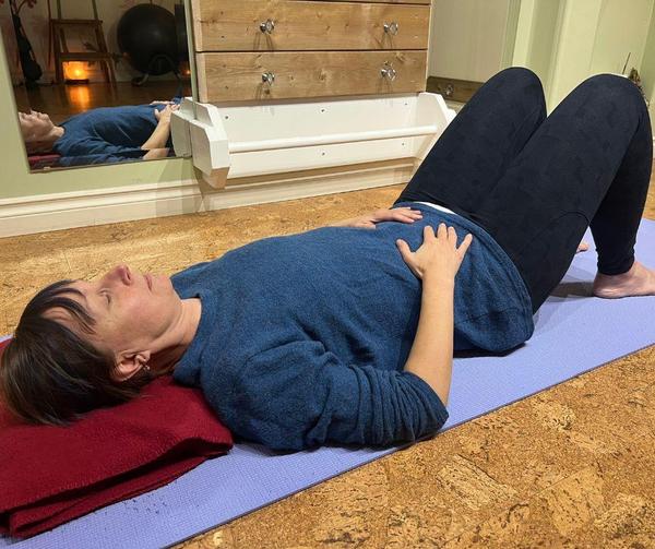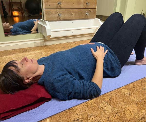 This breathing practice is traditionally done while lying on your back with your knees bent; however, if you plan to practice for longer than 2-3 minutes, I highly recommend supporting your knees. Use anything you have on hand to help your knees stay